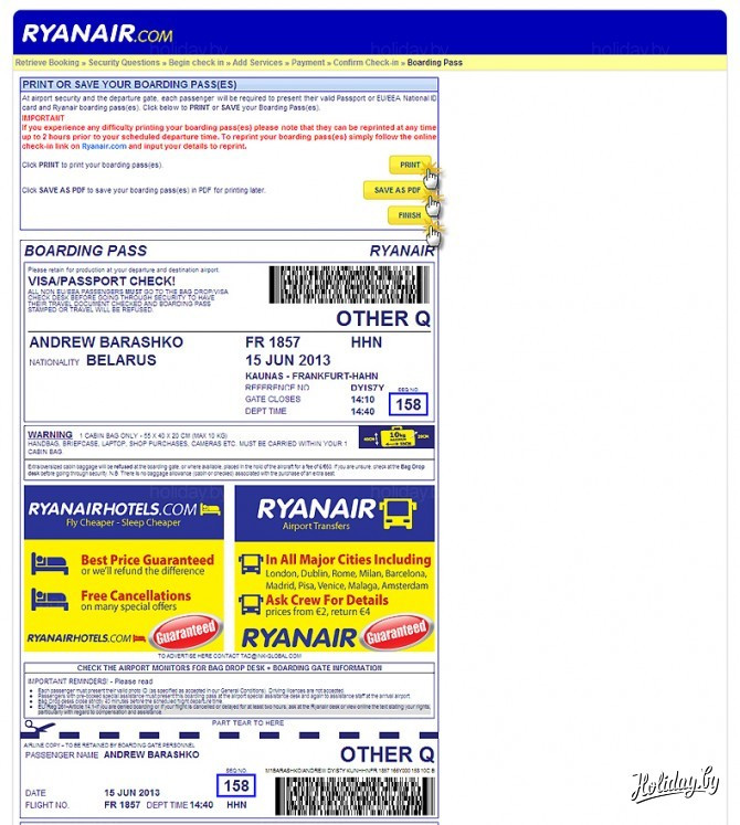 Шаг 11. Если всё сделано верно - перед вами будет подобного вида экран. На нём есть функция "Распечатать" (Print), сохранить в PDF (Save to PDF) ваш посадочный талон Ryanair. Напоминаем, что это обязательно для белорусов, так как необходимо при регистрации поставить штамп Visa Check (см. ниже). На самом посадочном талоне у вас будет напоминание по габаритам бесплатной ручной клади и поллиста рекламы дополнительных услуг авиакомпании. Выводим на принтер и можно думать о путешествии - мы зачекинились на рейсе.