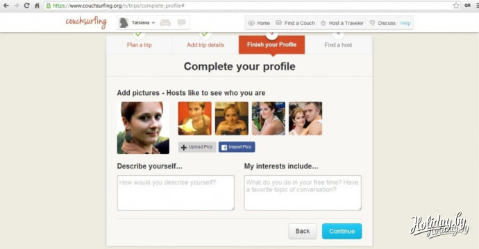 Следующий шаг – и он самый главный – заполнение своей анкеты. Это нужно сделать максимально полно и тщательно, на английском языке. Именно по этой информации вас будут оценивать, выбирать или… отказывать. Да, такое тоже бывает. Чаще всего в тех случаях, если в вашей анкете мало данных, недостаточно фото или ваши интересы не совпадают с интересами хоста или серфера. Ведь главная цель каучсерфинга – это, как мы уже знаем, общение и культурный обмен, а не возможность переночевать на халяву.