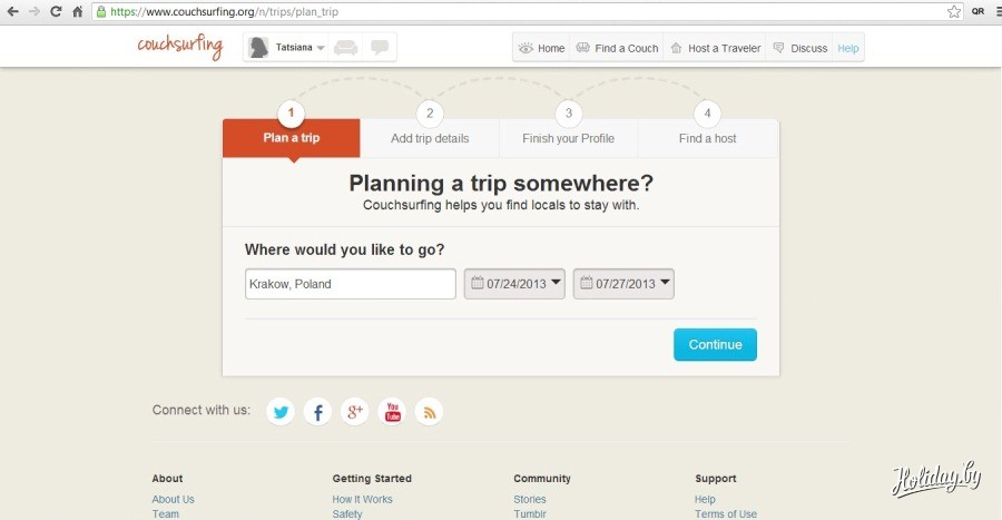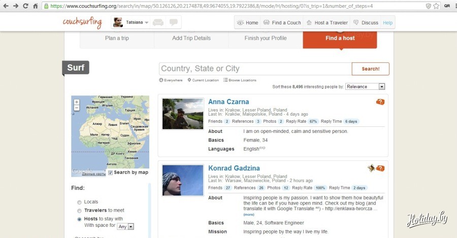 В моих ближайших планах – Гданьск. Но пока я не занимался поиском места проживания, это нужно делать ориентировочно за 2 недели до поездки. Что посоветовать новичкам? Заполняйте свою анкету максимально полно, загружайте больше фото, шлите индивидуальные запросы, а не копию одного письма десятку людей – это сразу заметно. Посещайте встречи каучсерферов в своем городе – это поможет ближе узнать людей и все движение. И путешествуйте!