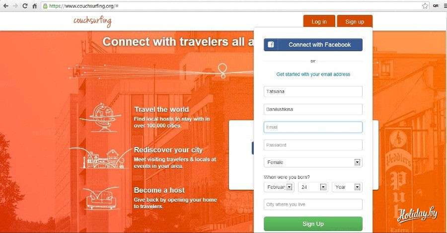 Влиться в общество любознательных, общительных и бесшабашных путешественников можно через аккаунт в фейсбуке или через стандартную форму регистрации.