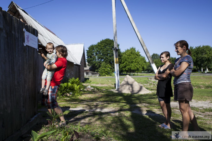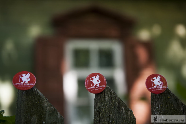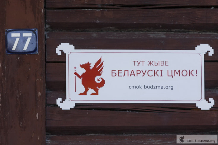 З дазволу гаспадыняў прыбіваем на хату нашую шыльду “Тут жыве беларускі Цмок!”, а кабетам пакідаем раздрукоўкі з сайта з найпадрабязнейшай інфармацыяй пра колішняга ўладальніка гэтага зуба.