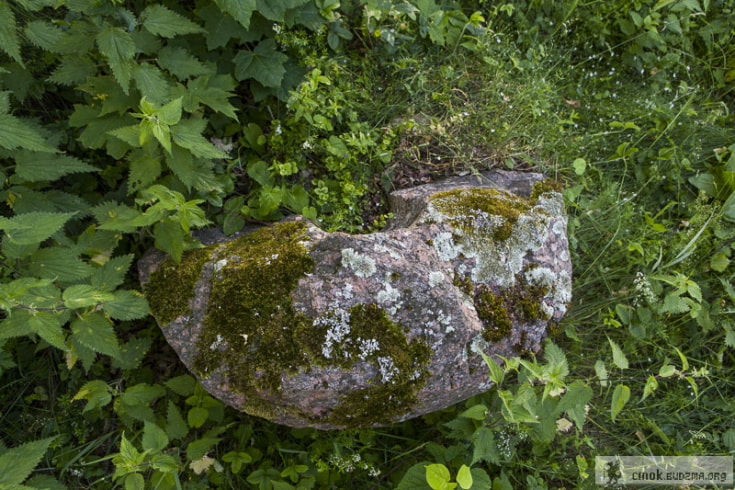 У Нясімкавічах спыняемся пры мясцовых могілках. Тут пад старым дрэвам ляжыць зусім незразумелы артэфакт — перабіты напалову рудніковы молат.