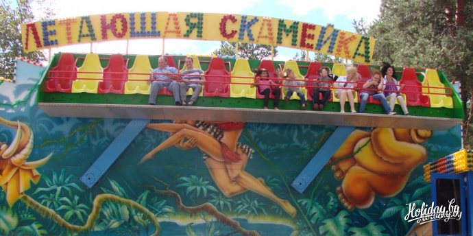 Аттракцион «Скамейка» (летающая скамейка), 4,500 рублей (3 минуты катания). Написано, что допускают детей от 14 лет, но как показала практика, возрастной ценз начинается с четырех. Причем 4-летних детей пускают даже без родителей.