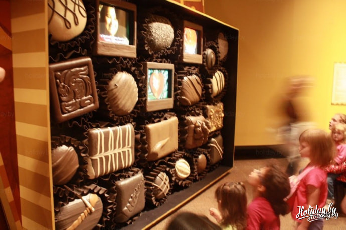 Но самым фантастическим зрелищем, пожалуй, считается огромный трехметровый шоколадный фонтан, по желобам которого стекает порядка 200 килограммов шоколада. Сотрудники музея окунают в фонтан вафли и угощают посетителей.
