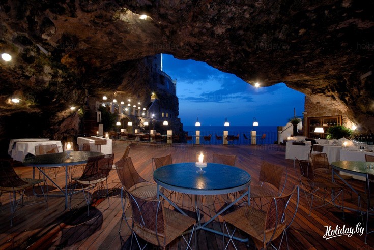 Бескрайнее синее море за краем пола и вековые скалы над головой. Ресторан Hotel Ristorante Grotta Palazzese разместился прямо в природном гроте на юге Италии. Здесь сливаются воедино природа и человек, мечты и реальность.
