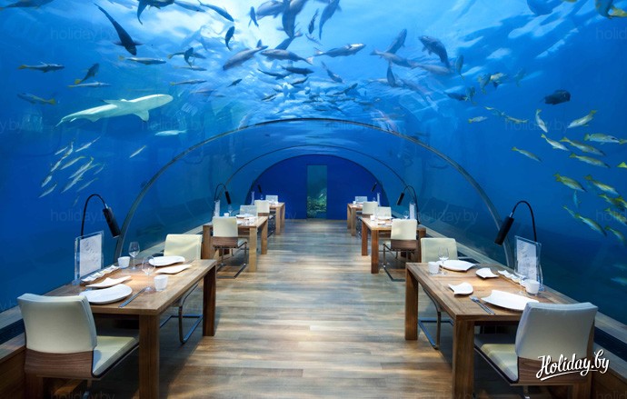С поверхности отправимся к глубинам. Ресторан Ithaa располагается под водой. И над головой посетителей вместо голубого неба – синее полотно моря, взамен облаков – кудри волн, как птицы пролетают стаями рыбы.