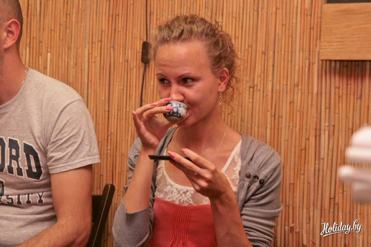 Алена Величко и опытные гости с удовольствием демонстрировали правильное чаепитие. Новички старательно повторяли. Так, например, нужно было аккуратно вытащить из пары пиал длинную чашку и подышать ароматом чая. Затем предлагалось посмотреть цвет настоя и выпить его из широкой чашки.