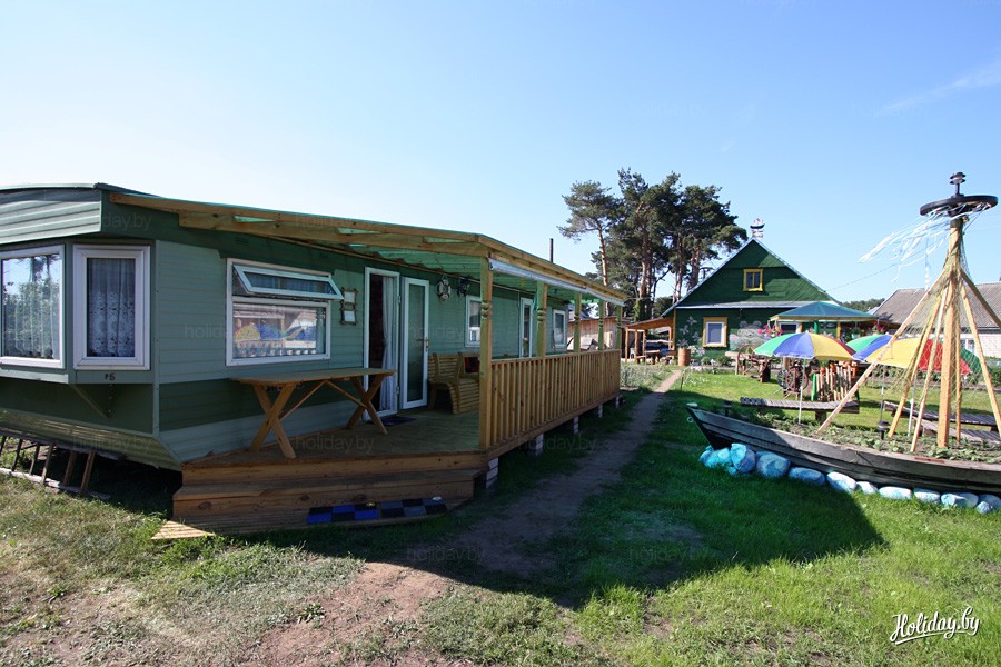Сами домики из Великобритании, приехавшие в Беларусь через Литву. В Англии по законодательству такие дома имеют свой небольшой срок эксплуатации и закон стимулирует продажу б/у дома. В результате белорусы получают отдых в немного б/у, но действительно хорошем состоянии комфортном доме со всем необходимым - от душа до газовой плиты с микроволновкой.