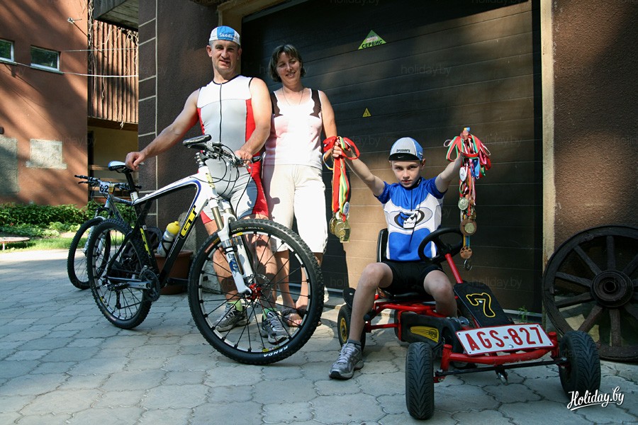 Юрий, Екатерина и их сын Глеб. В руках сына две огромные охапки всевозможных наград, которые он и его отец завоевали. Немногие могут похвастаться такой коллекцией. В поселке же семью знают по описаниям "А это те, кто и на лыжах, и на велосипедах? Есть такие..."