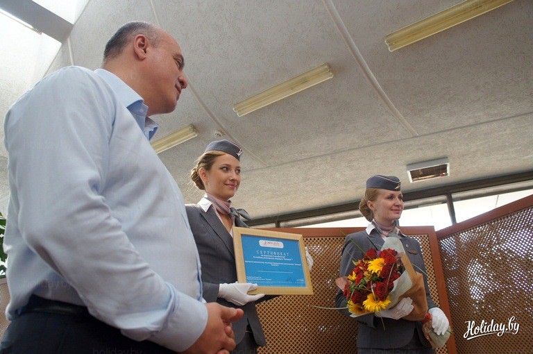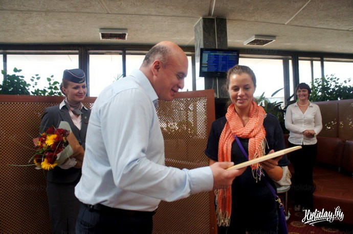 Вручил подарки и озвучил поздравления приятно удивленной пассажирке заместитель генерального директора по маркетингу и внешнеэкономической деятельности РУП «Национальная авиакомпания «Белавиа» Игорь Чергинец. По словам Игоря Николаевича, это еще не все сюрпризы, которые ожидают Ирину: в Лондоне представитель авиакомпании встретит почетного пассажира приятными сувенирами.