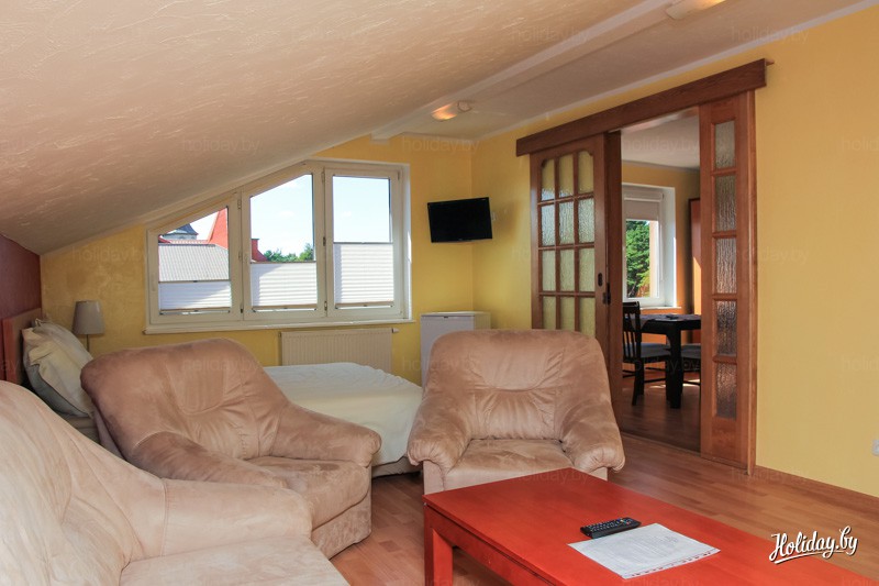 В этом гостевом доме можно арендовать как комнату, так и апартаменты на любое количество дней. Место одновременно в центре городка и на прямой дороге к пляжу - через сосновый лесок. Частный отель ставит своим девизом высокий сервис и не испытывает дефицита в постоянных клиентах.