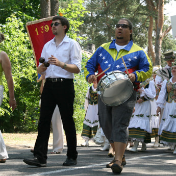 Не могу забыть ощущения, когда идешь в середине шествия. В его голове бравурно хренячит "Прощание славянки" от духового оркестра, а ближе к концу девушки латиноамериканской внешности колбасятся под такие же латиноамериканские барабаны. Если закрыть на секунду глаза, то становится крайне интересно... Между славянкой и венесуэлкой... Чем-то напоминает отечественную геополитику. Открываем глаза! Кстати, не все "латинос" были оригинальными - ряд из них были явно местного разлива. К чести этой "делегации", зажигали они ярко и весело.