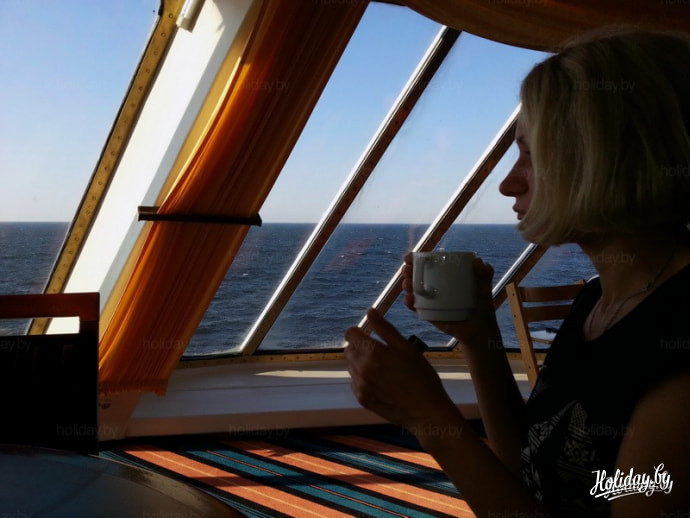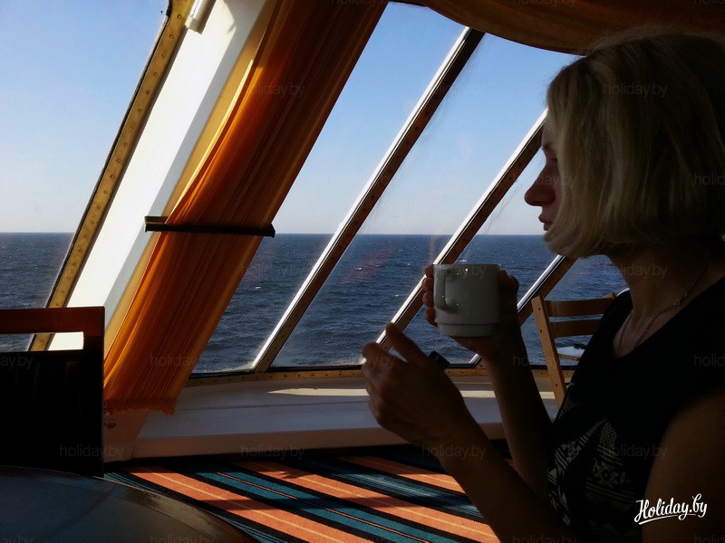 И вот утро. Завтрак, включенный в стоимость каюты, не просто обилен - он шикарен. Здесь есть все для мясо- и рыбоедов, а также фрукты и сладости. Главное его достоинство, как по мне - то, что выпивать утреннюю чашечку кофе можно с видом на море: здешний "Буффет" находится на огромной застекленной палубе.