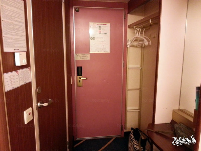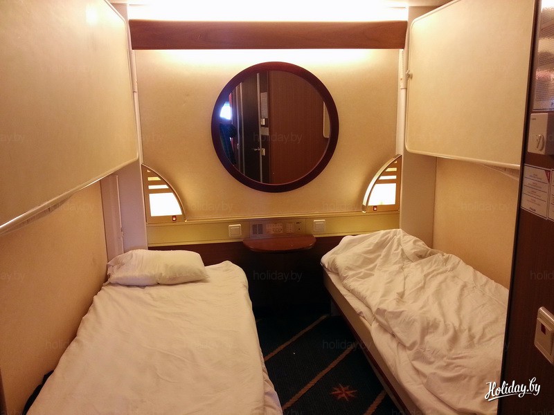Так выглядит типичная двухместная каюта. Правда, судя по двум неразложенным полкам сверху, она может легко превращаться в 4-местную. В иллюминаторе виден бескрайний морской... шкаф. Также в каюте есть радио, телефон, туалетный столик, кондиционер и вполне приличный санузел с душем и вакуумным, пардон, унитазом. Кстати, перед высадкой в Швеции большинство вещей можно оставить в каюте - обратно вы поплывете в ней же.