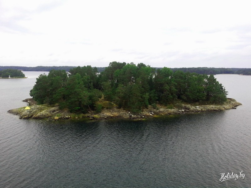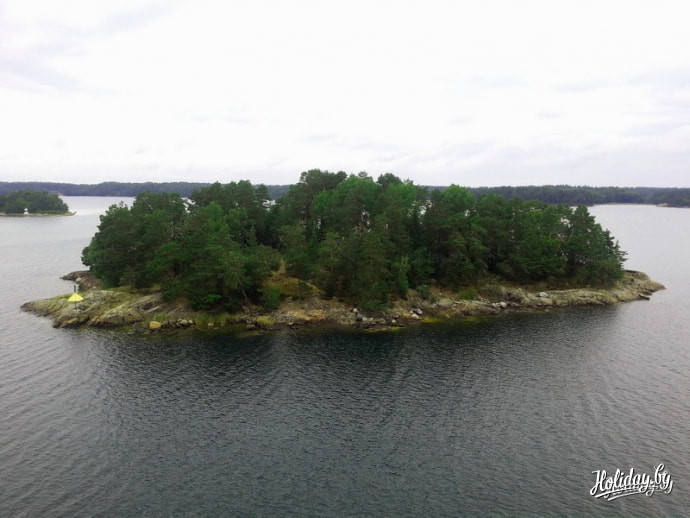А за бортом тем временем начинают встречаться заросшие лесом, как викинги щетиной, скалистые островки. Это уже Швеция. То есть осколки гигантского Стокгольмского архипелага - одного из крупнейших в Балтийском море. Паром очень долго идет среди этой изумрудно-скалистой россыпи. Вот, например, один из 24 тысяч таких островков. Почти на каждом островке стоит домик сурового шведа. Или хотя бы грибок от дождя для рыбаков.
