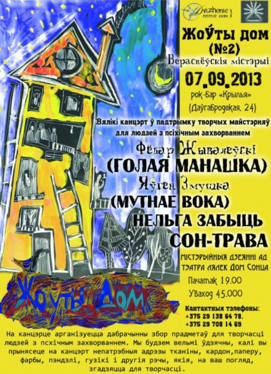 Калі хочацца драйву ці дабрачыннасці, можна спалучыць адно і другое і наведаць канцэрт-акцыю "Жоўты дом" у рок-бары "Крылья". Гэта вялiкi канцэрт-акцыя ў падтрымку творчых майстэрняў для людзей з псiхiчнымі захворваннямі. Каб дапамагчы, нясіце з сабою кардон, пэндзлi, паперу, гузiкi, непатрэбныя адрэзы тканiны i ўсё іншае, што можа быць годным да творчасцi. У канцэрце бяруць удзел Фёдар Жывалеўскi (гурт Голая Манашка), Яўген Змушка (гурт Мутнае Вока), гурт Нельза Забыць і гурт Сон-Трава. Акрамя музык яскравае мiстэрыйнае дзеянне прадставiць тэатр лялек Дом Сонца.