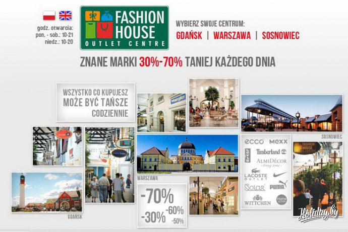 Fashion House Outlet Center построен в стиле старого города Варшавы и насчитывает в настоящее время около 100 магазинов женской и мужской одежды, обуви, детских товаров, товаров для спорта, галантереи, белья, товаров для дома известных брендов: Wójcik, Vistula & Wólczanka, Villeroy & Boch, Venezia, Verona, Umbro & Assics, Tuzzi, Trussardi Jeans, Trespass, Timberland, Tatuum, Stefanel, Salamander, Quiksilver Rossignol, Puere, Pinko, Paris Paris, Olsen/Bianca, Mustang, Marks & Spencer , Lilla Store, Lilla Store, Gino Rossi, Franco Feruzzi, Ferroni/Taurus и других.