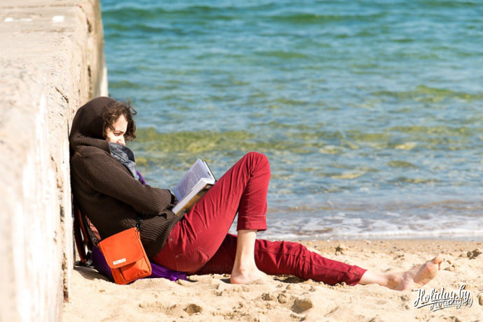 Морские пейзажи и теплое осеннее солнце притягивали к пляжу все новых и новых людей. Нельзя было не заметить, как отдыхают на пляже одесситы… Делают они это неспешно, чинно и без лишнего шума. Босая девушка в кофте с капюшоном сидела с книгой в руках, приткнувшись к большому камню. Рядом, спиной к спине, уютно расположилась пожилая пара. Супруги разгадывали японские сканворды и наслаждались морским бризом.