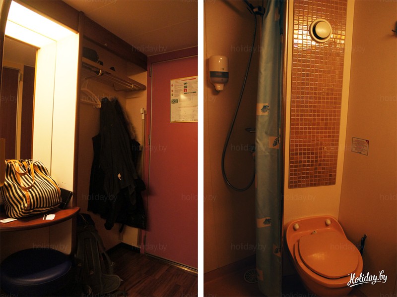 По внешнему виду она похожа на большое купе поезда, кровати только побольше, полуторные. Даже вдвоем спать на одной кровати при желании можно. Правда, не очень удобно, т.к. рискуете быть вдавленным в стену своим другом по постельному месту. По поводу антиаллергенности – каюта отличается от обычной лишь каким-то, как пишут на сайтах, специальным напольное покрытием.