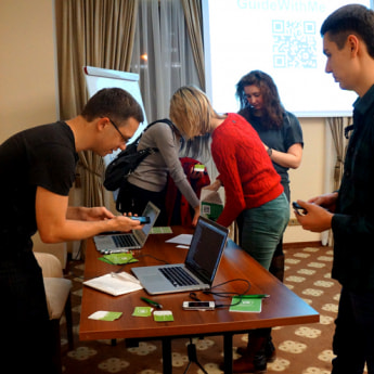 Руководители компании закачивают участникам презентации приложение MapsWithMe