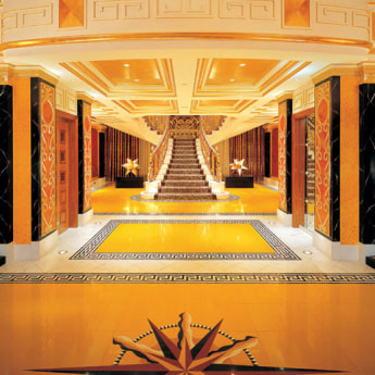 Двухэтажный номер площадью 780 кв.м. с видом на Аравийское море, вращающейся кроватью под балдахином, натуральными коврами, столовой, личным мини-кинотеатром, лифтом, мраморной ванной и лестницей с золотыми перилами поразит каждого посетителя своим восточным убранством.