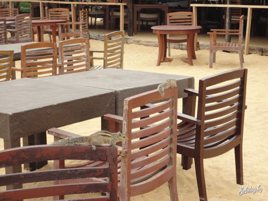 Прибыв в отель, все рванули на завтрак. И, конечно, на террасу с видом на океан. Какая прелесть: бурундучок! Маленький, миленький, и совсем не боится! Бежит, бежит к кусочку хлеба! Взял, но кто-то спугнул его!