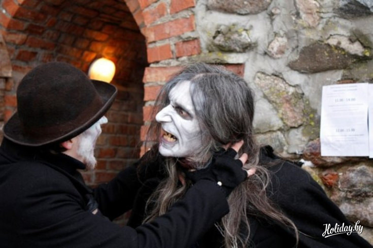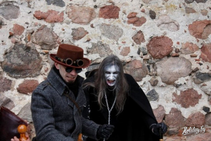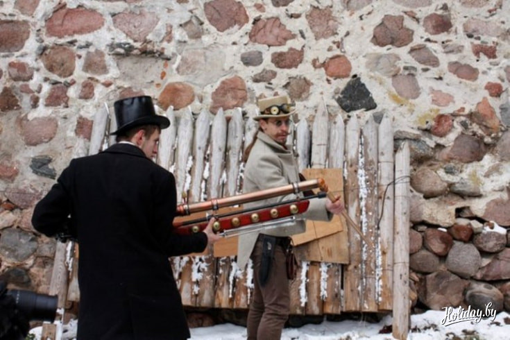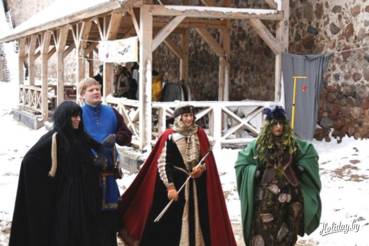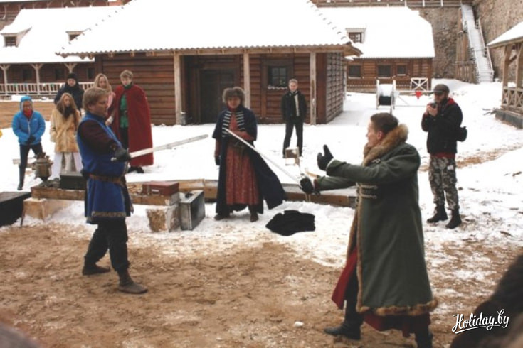 Итак, я в замке… Спустя несколько минут за мной вошла группа туристов, для которой, собственно, и предназначалось все зрелище. Долго не думая, я присоединился к ним. Встретили нас при входе в башню несколько шляхтичей, разыгрывая при этом иронично-комедийный спектакль. Играли, надо признаться, умело: эмоции, речь, жесты – все подчеркивало не первый год работы в этой сфере. В ходе постановки появлялись и женские роли, такие как княжна, кикимора и, так называемая, трасца (что по-белорусски является широким значением слов «лихо», «беда»). Хочу отметить, что костюмы проработаны своеобразно. Где-то есть элементы реконструкции, а где-то и стилизации, что совсем не портит картины. Действия начались, когда два шляхтича завелись в словесной перепалке между собой, которая тут же переросла в дуэль на мечах. Глаз порадовал отработанный бой. Несмотря на то, что на улице был существенный холодок, аниматоры старались расшевелить гостей разными методами.