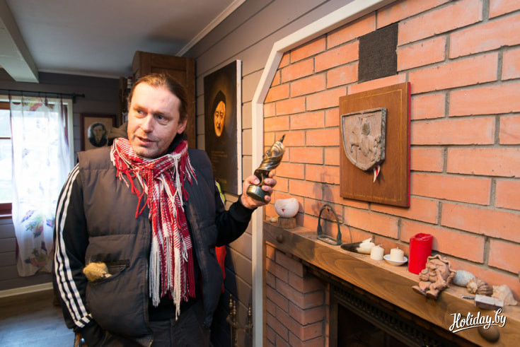 Над камінам размясцілася старажытная, на першы погляд, Пагоня. Але Зміцер па сакрэту прызнаецца, што гэта стылізацыя – якасная праца Яўгена Лукашэвіча, мужа Алены, якая распісала куфар. Тут жа – прэмія ад БНФ. “Прыемна, што я на сваім месцы на сваёй зямлі, як бы пафасна гэта ні гучала”, - падсумоўвае Зміцер. І за гэтыя словы яго нельга не паважаць.