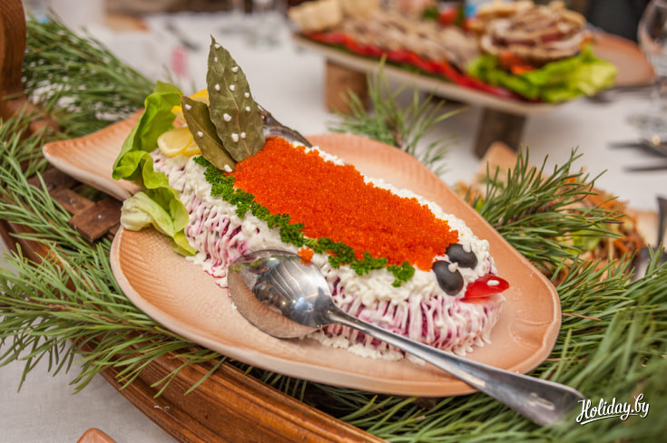 Не обошлось без любимого славянского блюда – «Селедки под шубой» с икрой летучей рыбы. Не думайте, на тарелках была вовсе не привычная нам советская «Селедка под шубой», а новое ее исполнение с необычной подачей. Итак, на блюде в форме рыбы выложен салат, покрытый необычной шубой с икрой летучей рыбы, килькой и лимоном. Подается это все на лодке с еловыми ветками, что придает блюду яркость и неповторимый аромат.