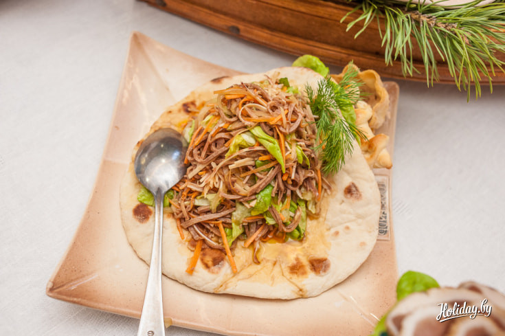Еще на столе был «Салат по-трактирски», поданный на лаваше, состоящий из пряной моркови, языка, отварных свиных ушей, репчатого лука, чеснока, зеленого салата, соли и перца, заправленный бальзамическим уксусом и соевым соусом.