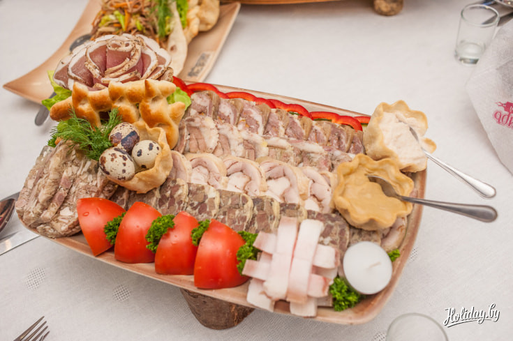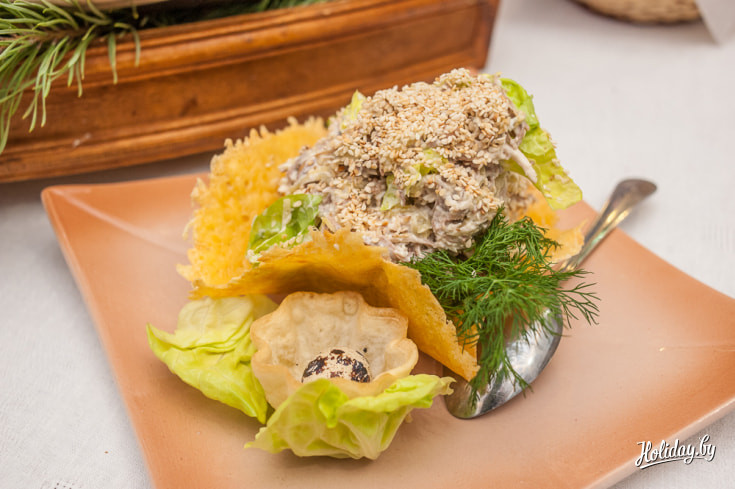 Golden-ужин начался с напитков: клюквенного морса и кваса собственного производства. А стол был уставлен настоящими яствами: «Закуска по старинке» – мясная нарезка, включающая язык, руляду, салтисон, сало, полендвицу, забор из дрожжевого теста, перепелиные яйца, хрен и горчицу. Еще на столе был салат «Разгуляй»: его кладут в испеченную сырную корзинку, а состоит салат из мелко нарезанных вареного говяжьего языка, куриного филе, консервированных огурцов, шампиньонов, соли и перца. Заправляется «Разгуляй» специальным соусом с добавлением горчицы, а сверху украшается кунжутом и зеленым салатом.