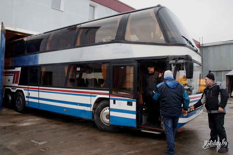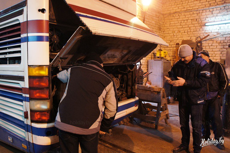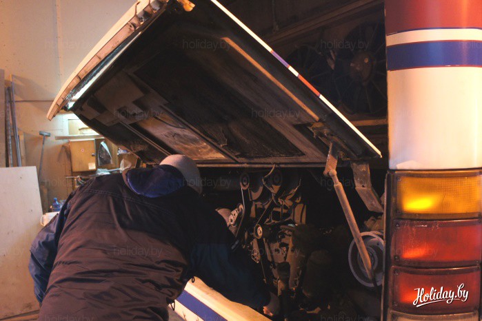 После детального разбора маршрута и нужных подписей в документах Holiday.by вместе с водителями отправляется из офиса транспортной компании в гараж. Здесь механик Андрей Гончаренко проводит технический осмотр автобуса.