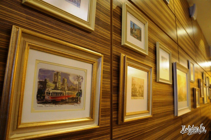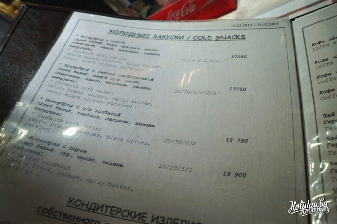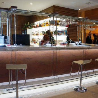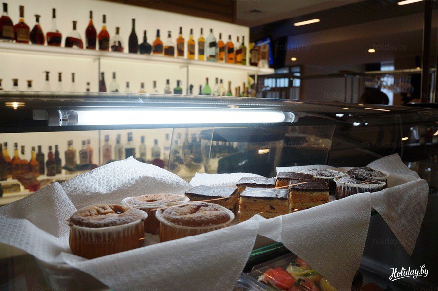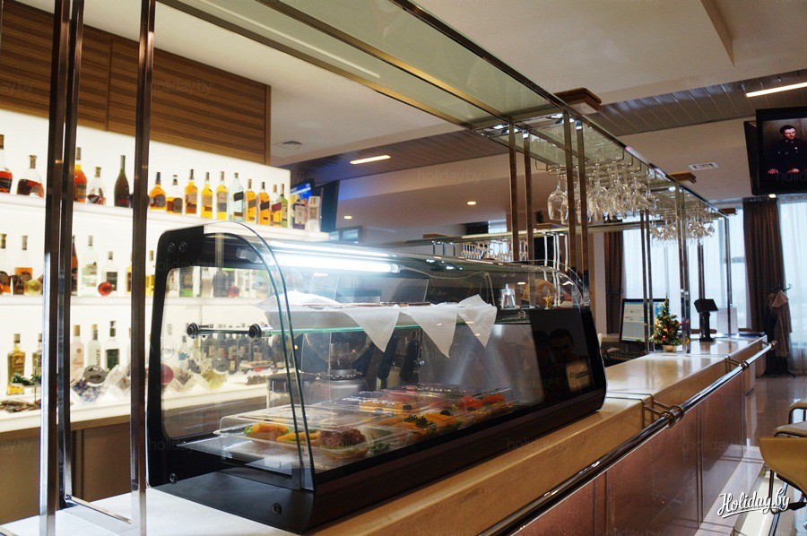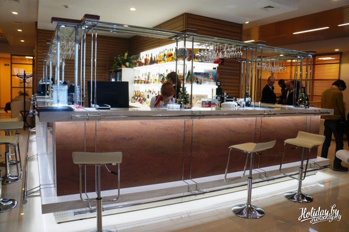 В баре посетителям предлагаются закуски, кондитерские изделия, чай, кофе и широчайший выбор алкогольных напитков – ассортимент занимает несколько страниц. Также к услугам посетителей – свежая государственная пресса.