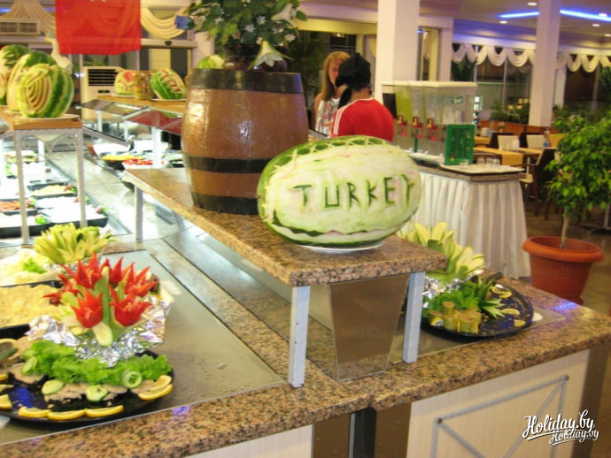 - Алкоголь. All inclusive просто «славится» алкогольными напитками местного производства. Прямо притча во языцех. Не то, чтобы местный алкоголь, который почти всегда используется в системе «всё включено» был каким-то странным, отнюдь – турецкий алкоголь не такой и плохой. Просто из-за непомерно больших акцизных сборов на алкоголь в стране куча подделок, чем и пользуются недобросовестные отели. Тут такое дело – не пить же всем туристам не прикажешь, а распознать подделку могут только истинные гурманы:) Наверное, для тех, кто особо боится отравлений лучше купить себе в проверенном месте нормальный алкоголь и довольствоваться им. А остальным … нуу, не все же в конце концов травятся, большинству скорее весело от алкоголя, чем грустно от его последствий. Тут выбор, скажем так, индивидуальный. Кстати, многие жалуются на разбавленный алкоголь. На самом деле, он не разбавлен, он специально так приготовлен и специально для туристов – только представьте, что случилось бы с безостановочно пьющим туристом в турецкую жару? Представили.. Вот-вот, тут лучше всё-таки немного разбавить:)