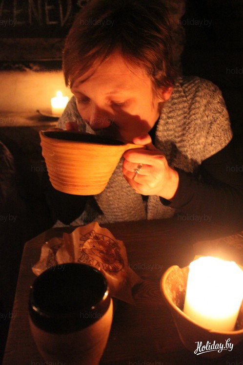 Сожгли калории, петляя по улицам. Кстати, сохранились средневековая планировка Таллинна и исторические названия улиц, много домов 13-15 веков. И – второй заход. Средневековое… Ммм… Кафе? Закусочная? Хозяйка заведения называла его «сказкой, которая может закончится прямо сейчас – достаточно выйти в дверь, или продлится столько, сколько угодно». Судите сами. Освещение только свечное. Грубые столы, сбитые из досок. Лавки и деревянные стулья, где пуфиками служат мешки с сеном. Глиняная посуда. Нет ни ложек, ни вилок, ни меню. На входе у хозяйки кафе «Третьего дракона» (III Draakon) можно спросить, что есть поесть и попить. Выбор небольшой – как и было в Средние века. 2-3 блюда, 2-3 напитка. В дополнение – вялености, пирожки, бочковые огурчики.