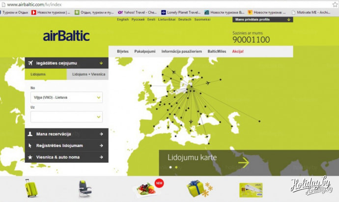 AirBaltic — латвийская национальная авиакомпания, созданная в 1995 году. Штаб-квартира располагается в Риге. AirBaltic представлена в том числе и в Беларуси. С недавнего времени компания полностью «переехала» в интернет – закрыла стационарные кассы и продает авиабилеты только онлайн. Относится к гибридным авиакомпаниям, т.е. совмещает в себе механизмы работы как классической авиакомпании, так и лоукостера. Купить авиабилет по доступной цене можно по акции. В «арсенале» - порядка 60 направлений, 35 из них доступны из Вильнюса. Однако потенциальным пассажирам стоит знать, что AirBaltic осуществляет все свои рейсы через Ригу. Таким образом, вылетая из Минска в Вильнюс и садясь на рейс этой авиакомпании вы обрекаете себя сразу на две пересадки. Хотя ради справедливости стоит сказать, что иногда бывает так, что даже с учетом двух пересадок перелет может обойтись дешевле, чем лететь напрямую другой авиакомпанией. Сайт авиакомпании http://www.airbaltic.com/.