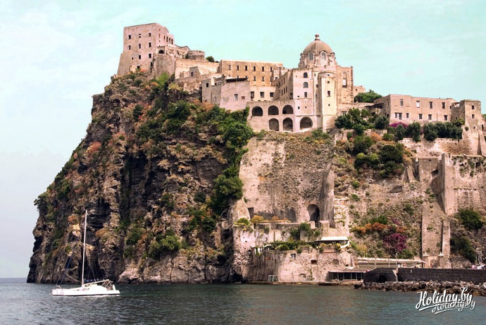 Прелесть не только в его внешнем виде, но и в древности стен: первое упоминание относится к 5 веку до нашей эры! Тогда он защищал от пиратов и завоевателей. А сегодня туристы могут посетить Арагонский замок, арендовав лодку или добравшись до него по единственному мосту. Но, оказавшись на острове, не стоит забывать о подъеме к самому замку по тропе мулов. Впрочем, можно воспользоваться и лифтом, шахта которого вырезана прямо в скале.