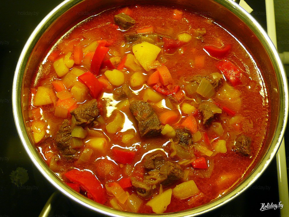 Гуляш сегодня знают, да и любят практически все страны. Но изначально это блюдо признали национальным венгры. К слову, гуляш в меню венгерской национальной кухни не мясо с подливой, а густой суп из говядины, овощей, красного лука и всевозможных специй (с обильным добавлением паприки), который долго томится на малом огне.