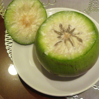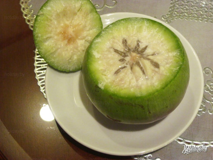 Когда его разрезаешь, то на ноже остается плотный белый налет, как после клея и, если попробовать, то он вяжет как хурма и действительно похож на клей. Но не стоит пугаться, масса внутри очень приятна на вкус, ее можно достать ложечкой, оставляя кожуру целой. Вот только не знаю, с чем сравнить это фрукт, все знакомые вкусы не дают полного описания букета. Скажу одно, это было приятно.