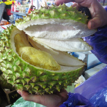 А это король всех фруктов – дуриан. При дегустации дуриана следует строго соблюдать несколько правил. Первое. Свое название фрукт получил не просто, он очень сильно пахнет, скажу прямо, воняет. В гостиницу с ним заходить нельзя, в самолет тем более, лучше попросить на рынке, чтобы вам его вскрыли и отдали содержимое. Второе правило, есть его надо сразу, пока он не начал окисляться и издавать неприятный запах. По консистенции фрукт напоминает крахмалистую массу желтоватого цвета. Утверждение, что вкус у него как у клубники со сливками, очень поэтизировано. Так как дегустацию дуриана проводили коллективно, то, опросив всех участников, выяснить оттенки вкуса оказалось невозможным: кто-то сразу почувствовал аромат жареного лука, а кто-то сказал, что лук это вкусно и не надо так льстить дуриану. Но это не значит, что я вас отговариваю от него, попробовать нужно обязательно, но вы, скорее всего, не захотите повторить процесс.