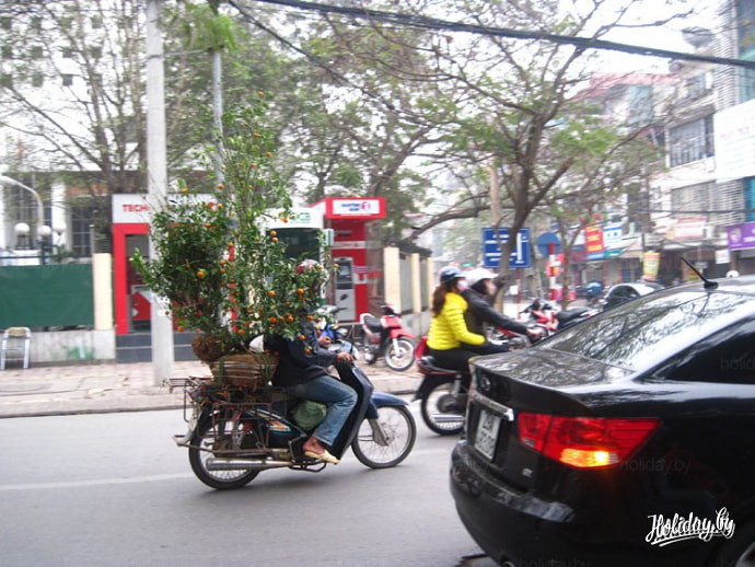 Про мотоциклы я уже рассказывала, их здесь много. Перевозят на них все, что угодно, даже то, что, казалось бы, невозможно водрузить на этого железного коня. Когда вьетнамцы едут с маленькими детьми или с зонтиком в руках, или одной рукой набирают СМСку – это уже не удивляет. Но они умудряются перевозить на мотоцикле огромные деревья в кадке, большие поклажи, целых свиней, кур и даже буйвола.