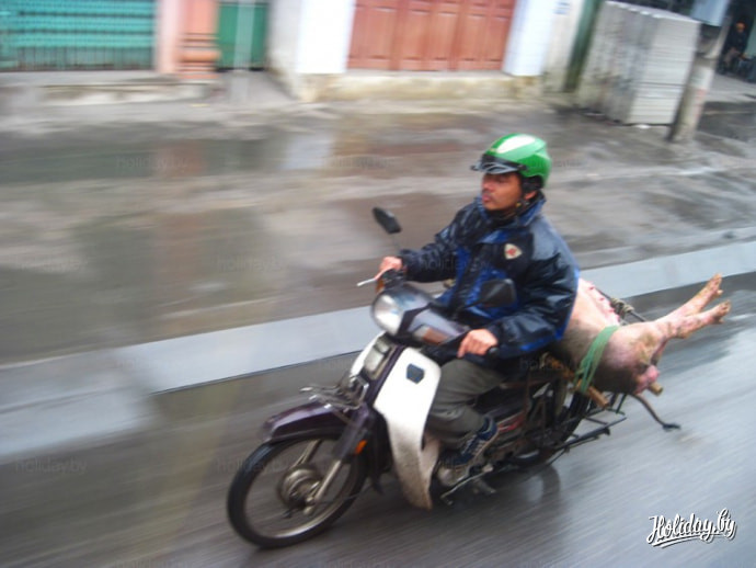 Причем животных они перемещают на дальние расстояние живыми, а не в виде туши, как можно было подумать. Находчивые вьетнамцы предварительно добавляют в корм свинье или уткам запрещенные вещества (вы понимаете, наверное, что я имею в виду), животные находятся «под кайфом» и спокойно переносят дорогу. Свиней они привязывают к сидению мотоцикла, а буйвола укладывают на тележку, которую в свою очередь цепляют к этому транспортному средству. А вот уток или кур просто за ноги подвешивают на палке вниз головой, они так болтаются, глаза у них выпученные, ничего не понимающие. Зрелище еще то. Жаль, что не удалось сфотографировать.