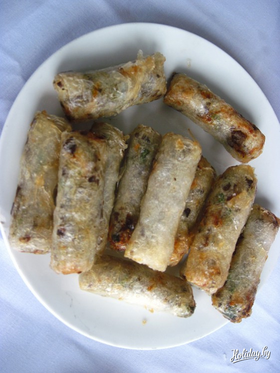 Вьетнамцы с их понятиями – это хорошо, но обед по расписанию. Удалось выяснить, какое блюдо самое распространенное в этой стране. Это рисовые блинчики с начинкой, которые имеют название «нем». Рецепт прост: в рисовую «бумагу» заворачивают мелко нарезанные овощи, морепродукты, грибы, мясо, курицу и специи. По отдельности и в произвольных сочетаниях. Могут вообще все смешать и закрутить в блинчик. Потом его обжаривают во фритюре.