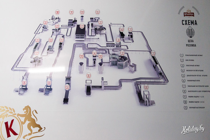 И первая остановка – подробная карта пивоварения, где гостям расскажут весь процесс изготовления пива: от поступления ячменя до транспортировки готовой продукции. Производство максимально автоматизировано, участие человека в приготовлении пива сведено к минимуму. Производство на «Кринице» не только бесконтактное, но и безотходное. Сусло поступает в фильтрационный чан, где от готового сусла отделяют жидкую часть и густую фракцию (дробину), которая после отдается в хозяйство на корм животным.