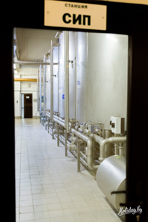 В следующий раз группа остановится у СИП-станции мойки, где происходит дезинфекция оборудования. Очистку оборудования доверяют только машинам, потому что человек не сможет добиться такой чистоты.