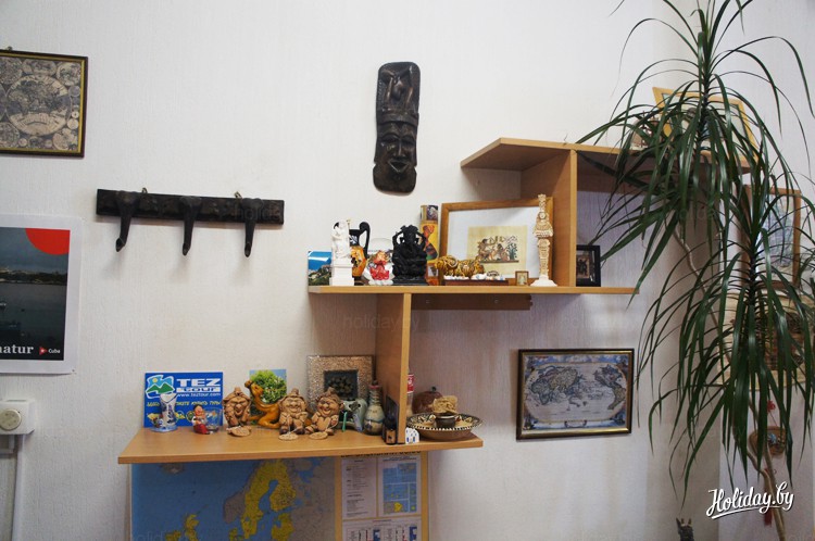 Здесь можно увидеть кораблик из Греции, ритуальную маску из Туниса, богиню плодородия из Турции, песок из самой Сахары. Настенное деревянное украшение, которое предположительно должно было стать вешалкой для пальто, почему-то с этой функцией не сжилось и теперь занимает центральное место импровизированной экспозиции. Китайские студенты, с которыми дружит агентство, привезли свой традиционный чай. А один из талантливых сотрудников сам нарисовал несколько копий старинных карт мира XIX века. Вот и собралась полноценная коллекция, которая радует гостей всех возрастов и самих работников «5 звезд».