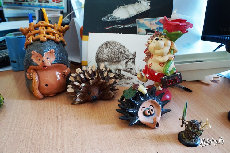 С легкой руки специалиста по туризму Александры Володиной, в компании «Колесо путешествий» поселились ёжики. Не настоящие, разумеется, но от этого не менее привлекательные. Александра признается, что начала собирать колючих зверюшек примерно 10 лет назад. Она считает их самыми лучшими животными в мире и искренне любит. Сначала девушка покупала фигурки и изображения ёжиков сама, но поскольку большую часть своей жизни люди проводят на работе, хобби не смогло обойти стороной и рабочее место.
