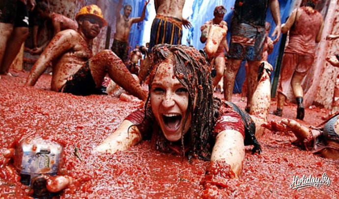 "Томатино". Каждый год, с 1945-го, в последнюю среду августа (если есть виза, успеваете!)на узеньких улочках испанского города Буньоль начинаются томатные бои. Более ста тонн помидоров превращаются в веселое оружие, кстати, выделенное властями города. И не надейтесь стать первым чистым участником и не жалейте помидоров, те, кто не хочет выпачкаться, сидят дома. Ведь на любого прохожего могут "наехать". Если когда-либо вы хотели запустить в недруга помидоркой – вам стоит купить тур в Испанию. Улицы превращаются в настоящие томатные реки, участники - в ходячие помидоры. Все в самой старой одежде, ведь надеяться отстирать вещи после таких сражений, что надеяться слетать в другую галактику. Нашему поколению это не под силу. И кидайте, купайтесь и развлекайтесь. Томаты правят миром)