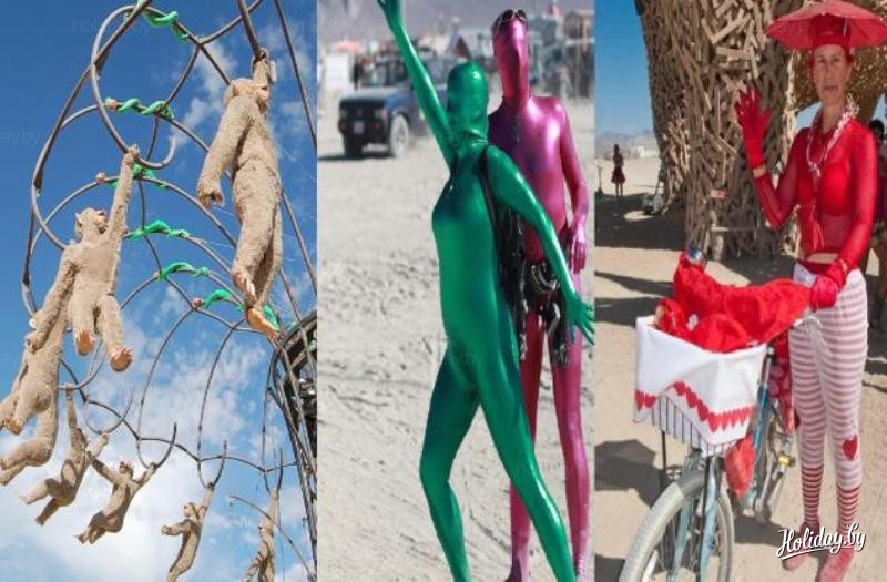 Арт-фестиваль "Горящий человек" . За 8 дней до первого понедельника сентября (День Труда в США) люди двигаются к пустыне Блэк-Рок. И там воздвигают собственный город, который собой и заполняют. Задача всех гостей – выжить в новом мире. А мир этот невероятно странный и интересный. Люди там все творческие, необычные, с чувством юмора. И на каждой улочке вы можете встретить таких странных людей, в немыслимых одеждах, разрисованных, с интересными аксессуарами, а не заблудиться в городе помогают названия, которые даются каждой улице.