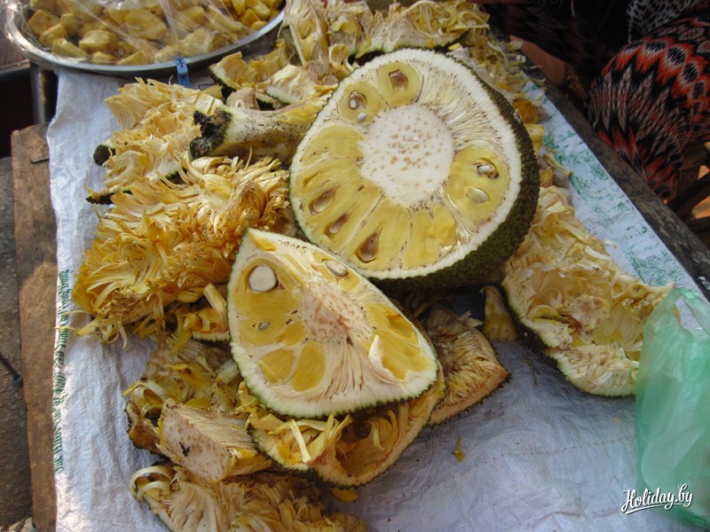 А вот что точно вам понравится, так это джетфрут или плод хлебного дерева. Вкус у зрелых плодов нежный, что-то между папайей и ананасом. Незрелый джекфрут используют как овощ: жарят и варят. Говорят, по вкусу как картофель, но мне не довелось ни увидеть этот процесс, ни попробовать. Верим на слово местным.